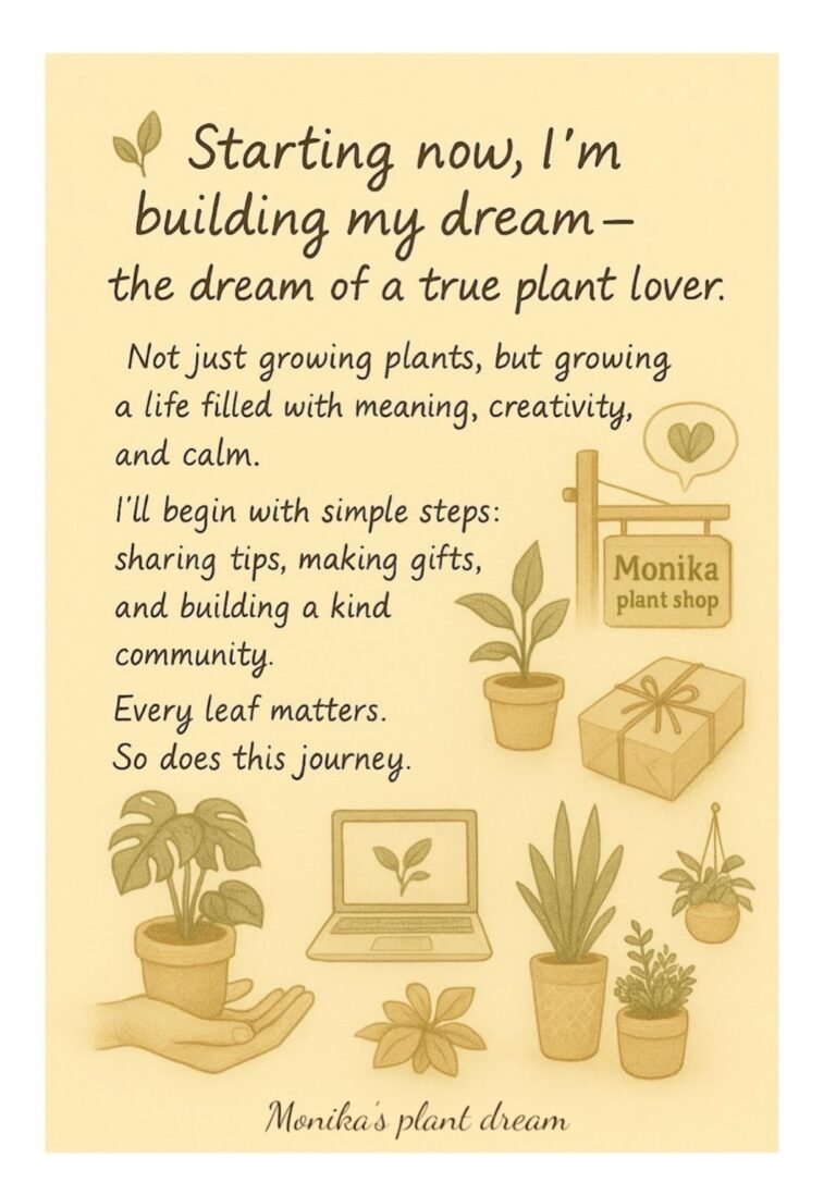 Monika, a plant lover. Her house is already full of plants, and still she can’t stop herself from bringing new ones home. She knew her love for plants was more than a hobby, yet it felt hard to name. She often described it as holding something precious in her hands but not knowing how to let it grow—or where to begin.