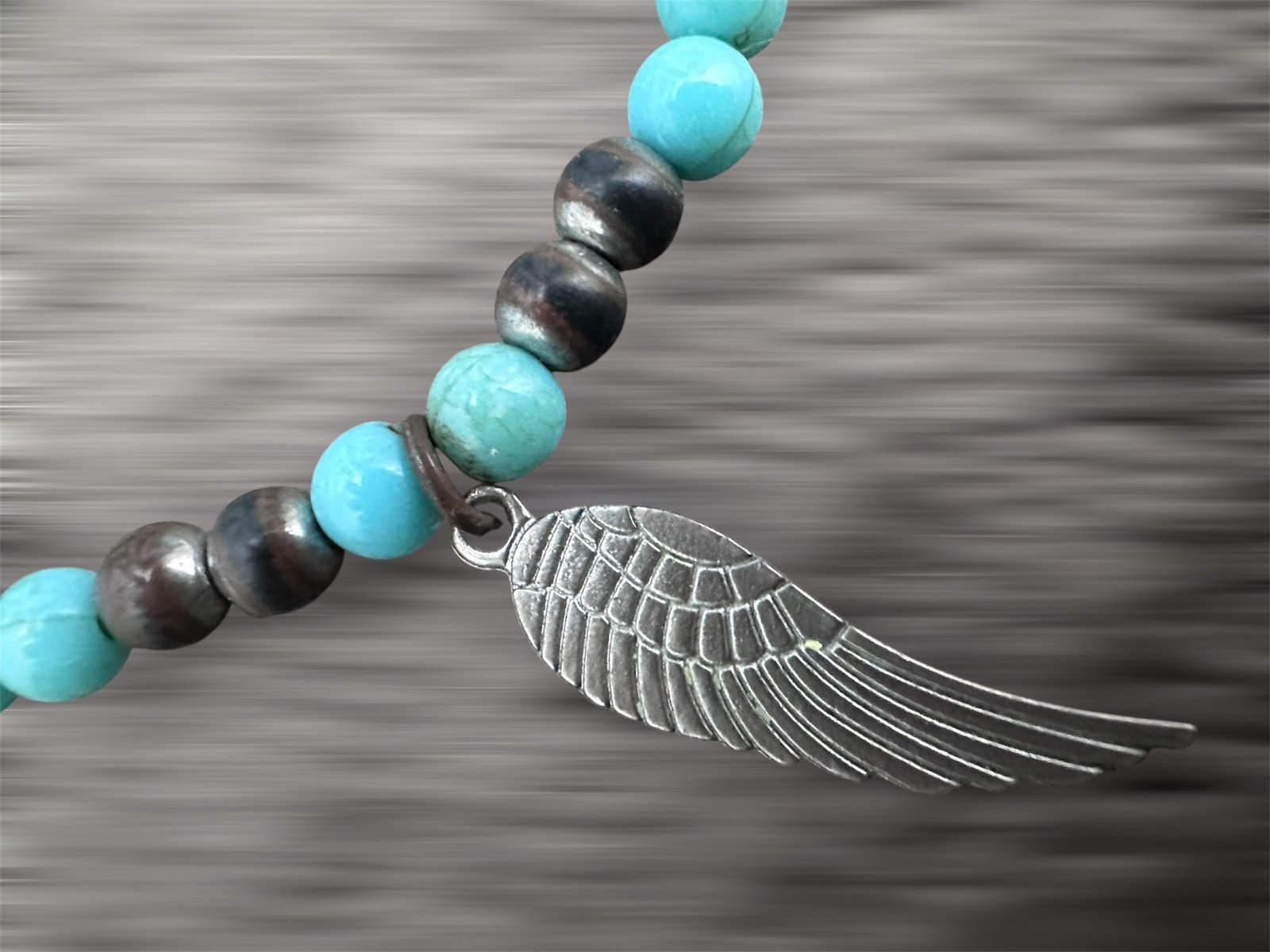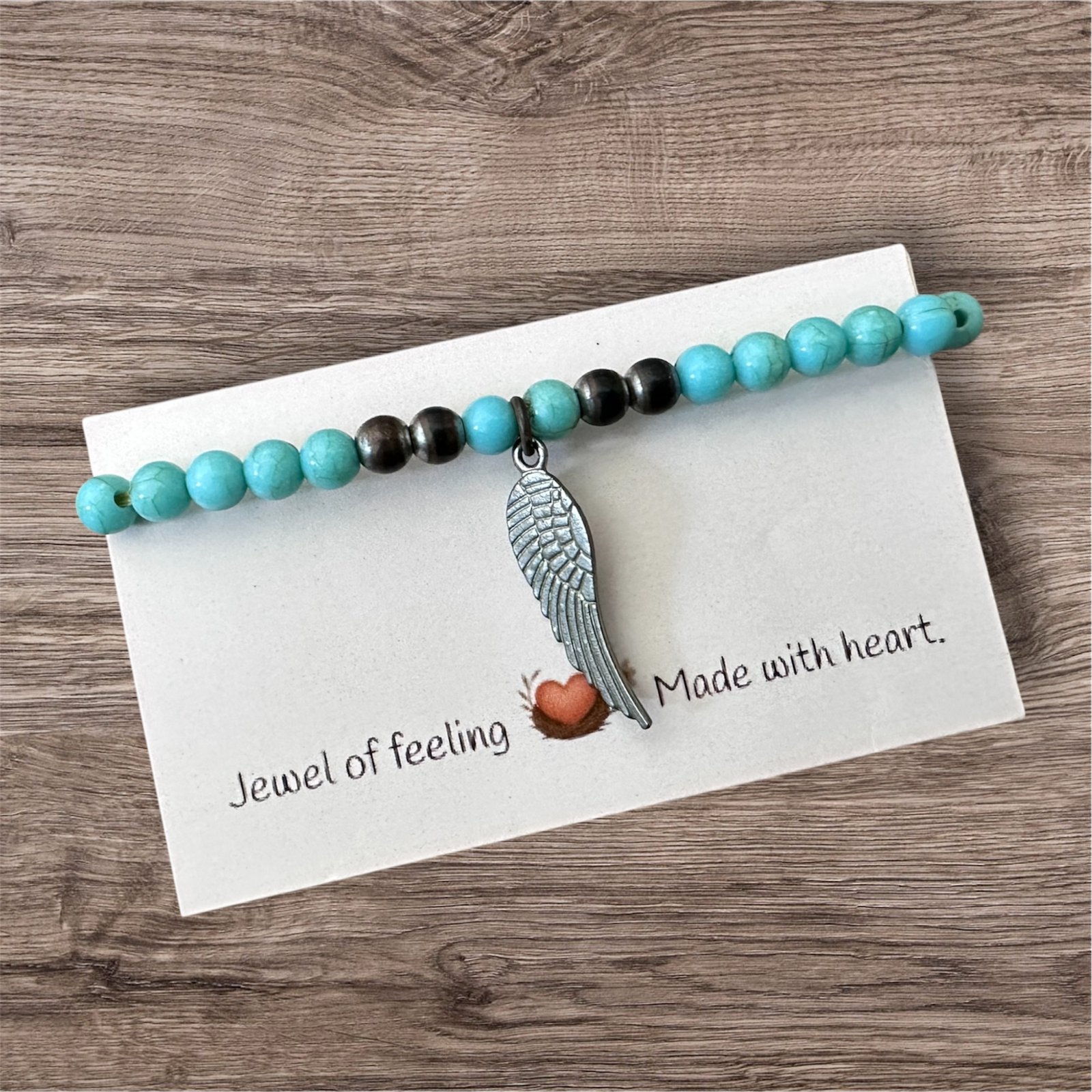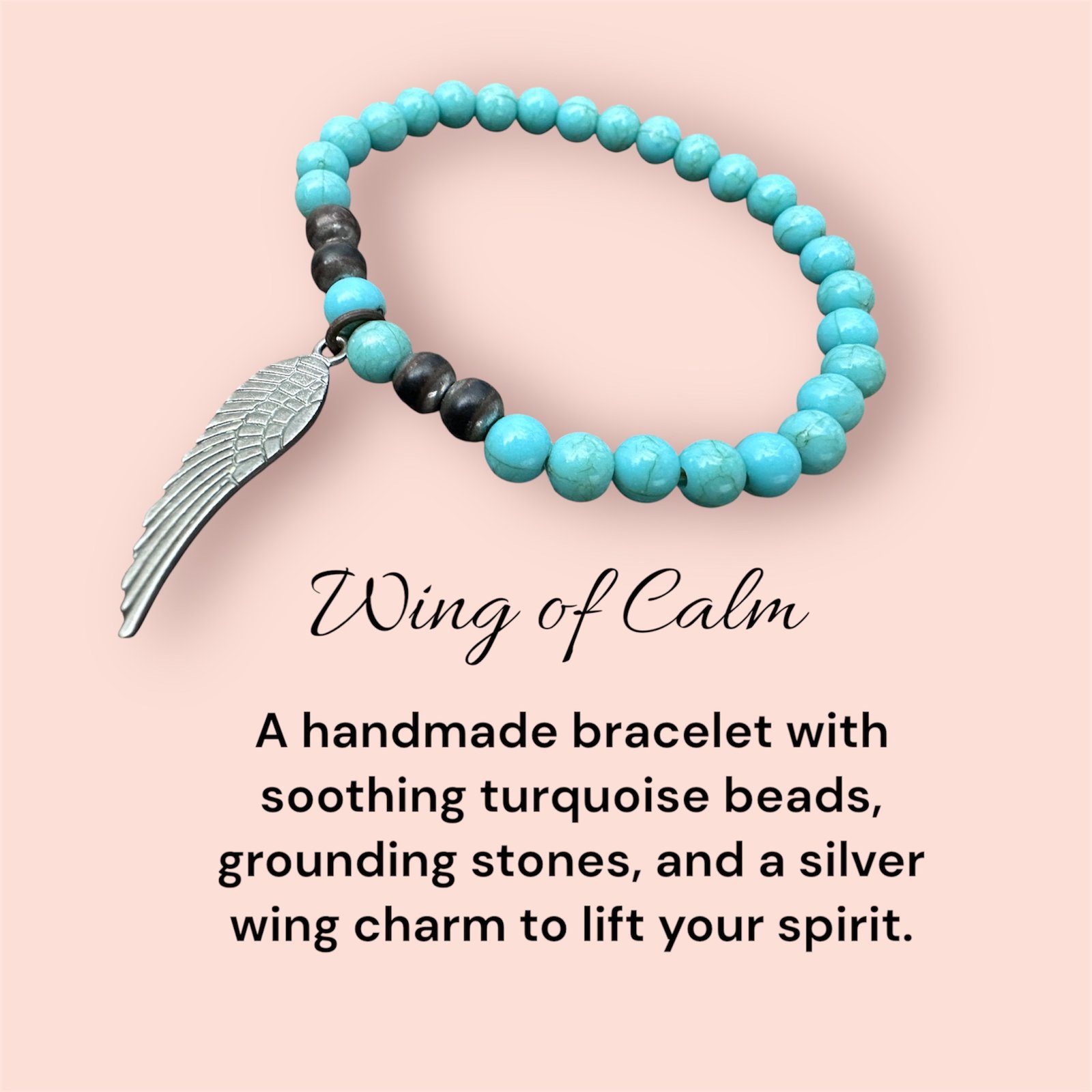 A handmade bracelet with soothing turquoise beads, grounding stones, and a silver wing charm to lift your spirit.
